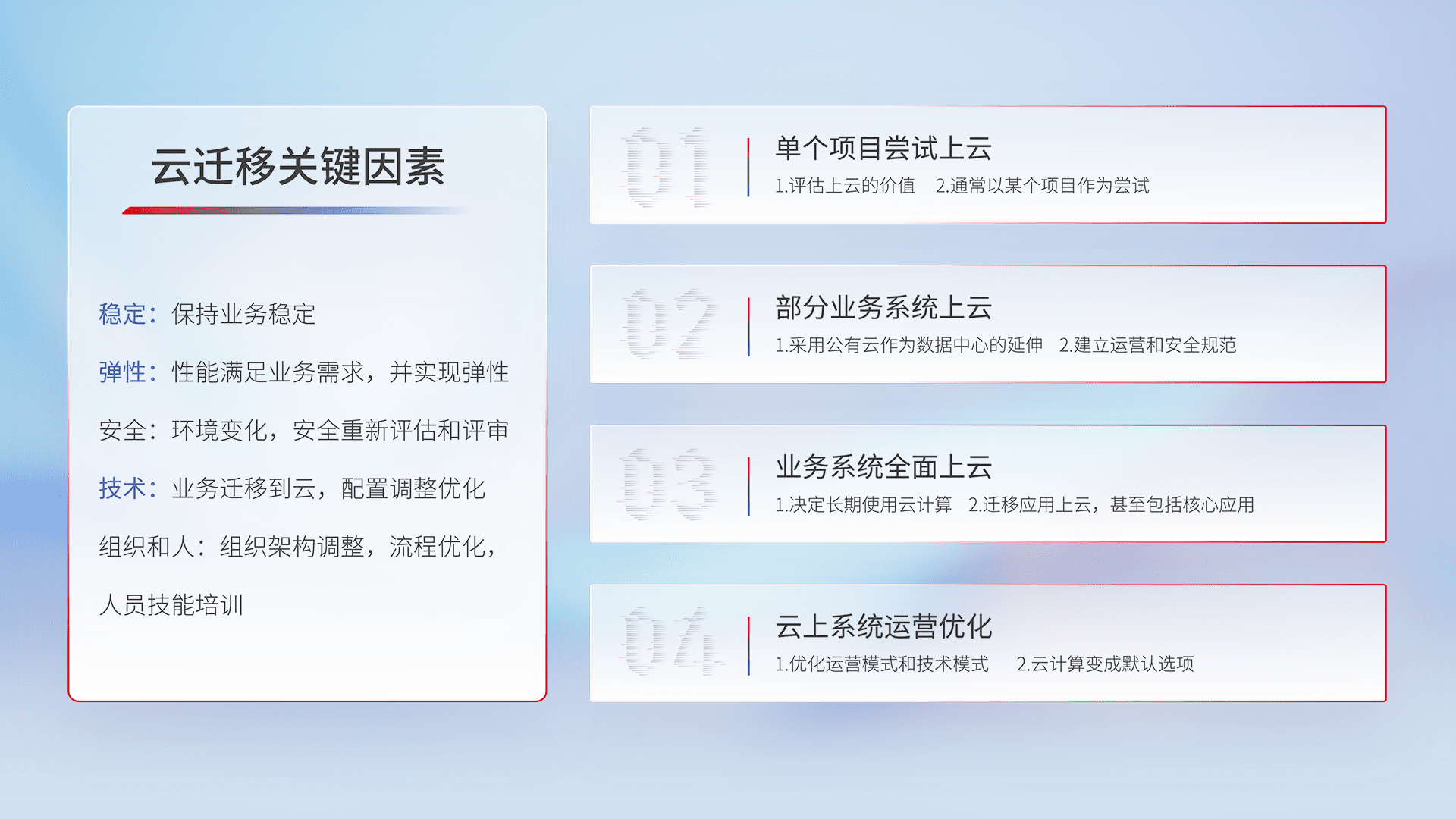 结合实际业务,,,,从规划设计、、云平台选型、、、、云原生改造、、、数据迁移、、集成交付,,,迁移全过程为客户识别最佳上云路径,,做好风险识别管理,,设计网络架构、、、身份权限、、、、安全审计合规、、、、操作审计、、、、日志审计、、监控告警策略、、、多站点容灾设计等,,,对云上基础设施进行整体规划,,,提升IT治理水平,,,以满足弹性、、、高可用、、高性能的需求。。