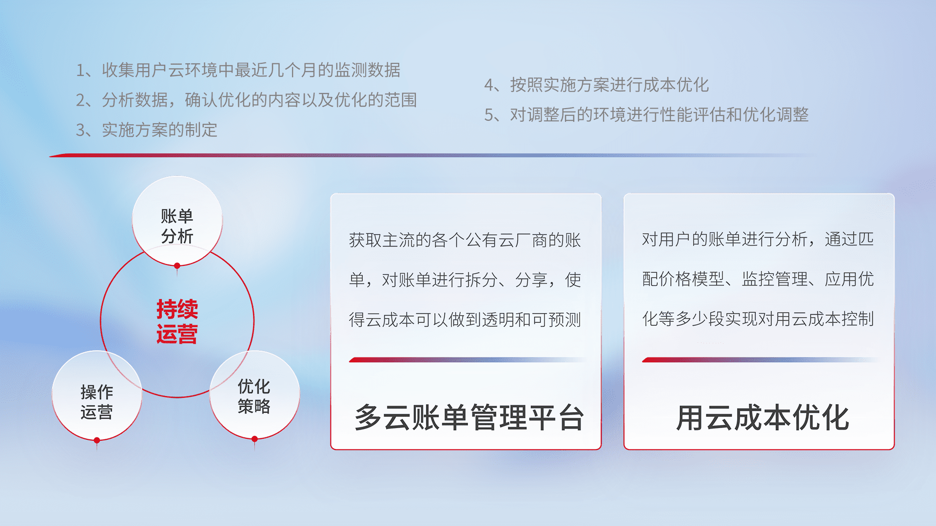 通过多云纳管,,,,以统一的资源数据模型把客户的云资源进行抽象和封装,,,进而实现对多云资源的统一操作,,保障云资源管理的可靠性、、、稳定性与可用性。。。。量身定制化运维内容,,,,配置、、、开发运维、、、、补丁管理、、、、备份、、、监控、、、、认证和访问管理、、审计和日常巡检等,,,,保障在用云过程中的可靠度,,,,稳定度以及高可用率。。