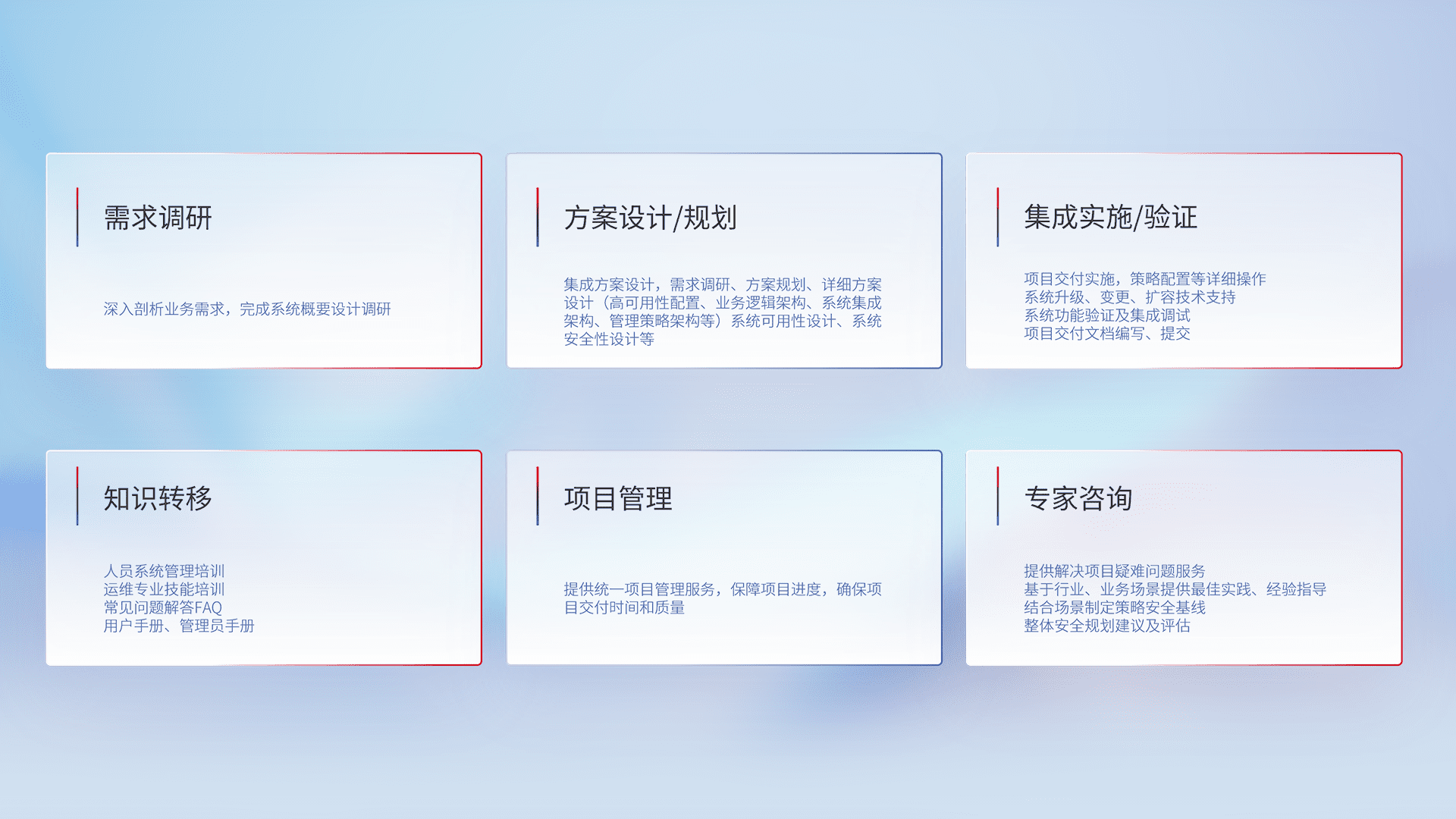 针对客户行业特性,,将宏观的安全战略和需求,,通过专业的交付服务,,,实现项目落地,,,为客户提供标准规范的集成交付服务。。。